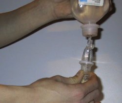Die Tropfkammer durch Druck auf die Infusion füllen. Den Rollverschluß